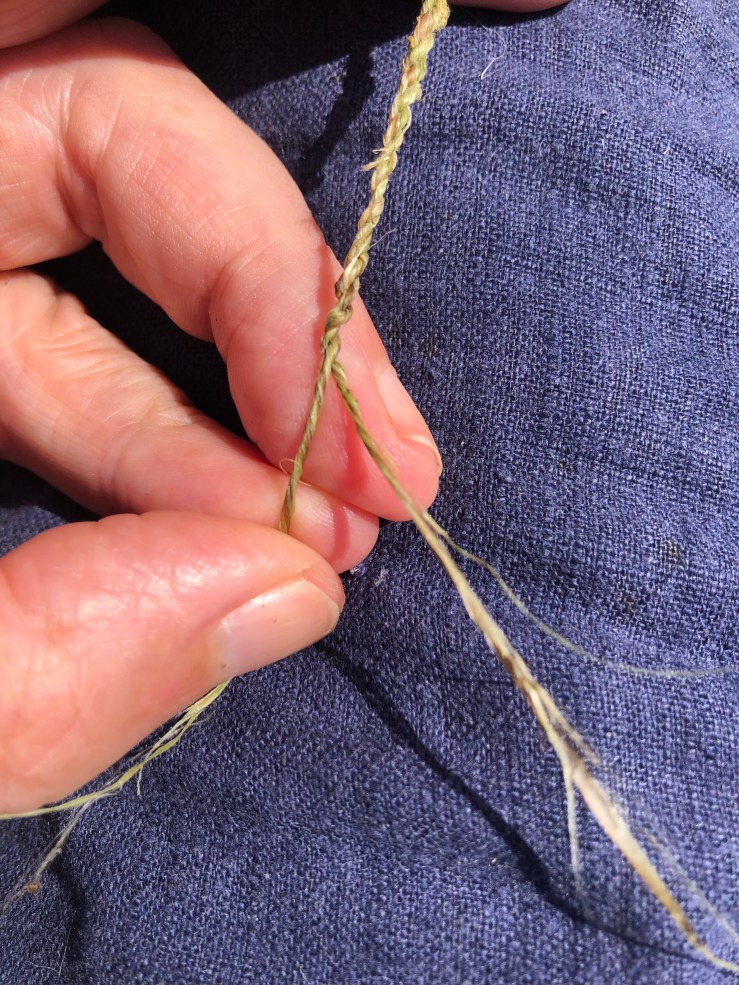 I am outdoors in the late summer sun and so I lay the fibres out on the bare skin of my thigh, they stick to the skin, nettle juice holding them in place in the breeze till they dry and want to fly away